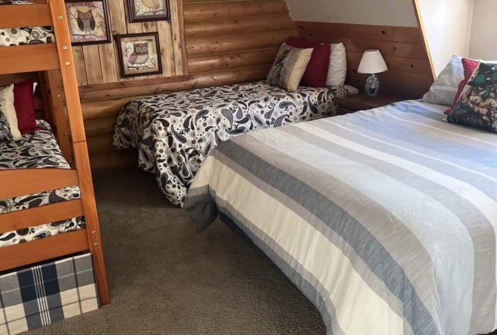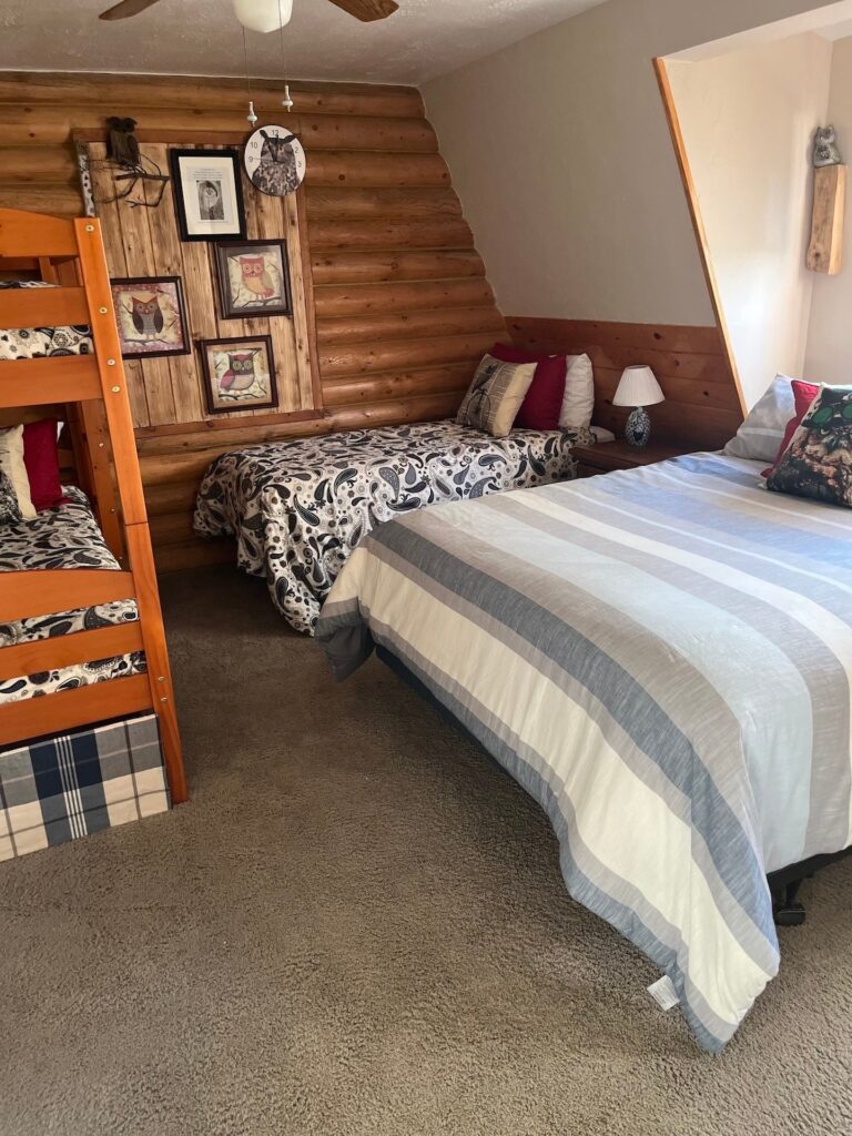 Decorated in an OWL Theme, this room has a queen bed, a bunk bed, and a narrow single bed. It is ideal for a couple and three children.