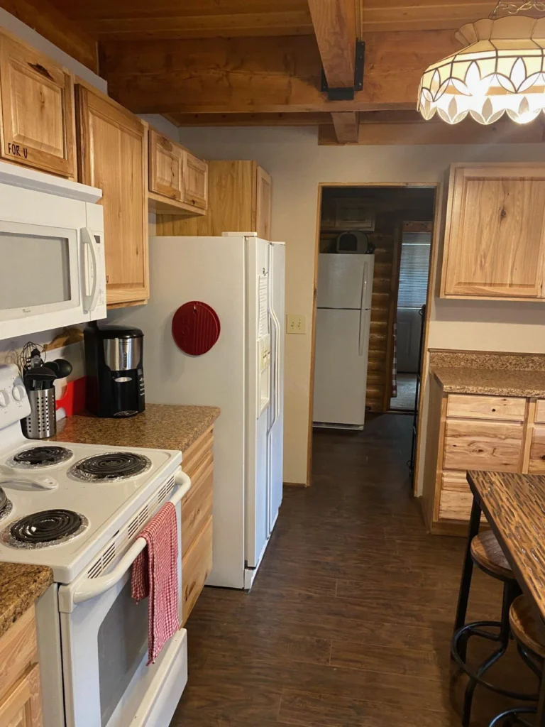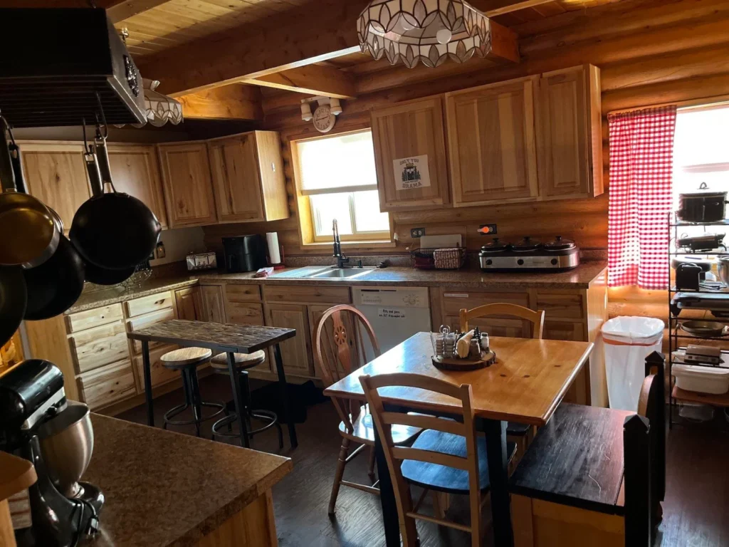 There are two kitchens within the cabin. Both can be used for the preparation of food and clean-up. The kitchen prep areas are on each side of the Gathering Place so meals can be prepared and enjoyed away from the hustle and bustle of the kitchens. The west kitchen has three refrigerators, a dishwasher, and a stove along with a microwave.